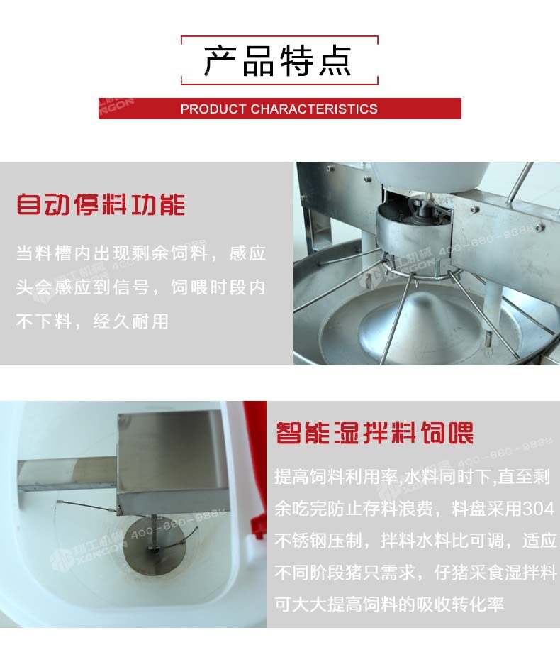 5.智能濕拌料飼喂,提高飼料利用效率。水和料同時下,在料盤內混合成適口性 較好的濕直到剩余飼料被小豬吃完,防止料槽內存料過多造成浪費。料盤采用304不銹鋼整體壓制,拌料,水料比可調節,以適應不同階段的豬只需求。仔豬采食濕拌料可以大大提高飼料的吸收轉化效率。