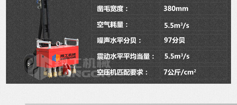 11頭鑿毛機的鑿頭有11個,它的鑿毛能力是指混凝土強度在C30-C40之間的參考 值,根據施工混凝土強度和鑿毛頭的鋒銳程度的不同,鑿毛效率會 有所區別。鑿頭高速敲擊混凝土,處理后表面比研磨和銑刨的粗造。一次可去除混凝土厚度達 0-8mm。特別適合高速橋面等高質量鑿毛。因其獨特的工作方式, 可對C50的高強度混凝土鑿毛,是世界上頂尖的鑿毛工具。該11頭鑿毛機,鉆錘設計,獨特的工作頭為合金剛
