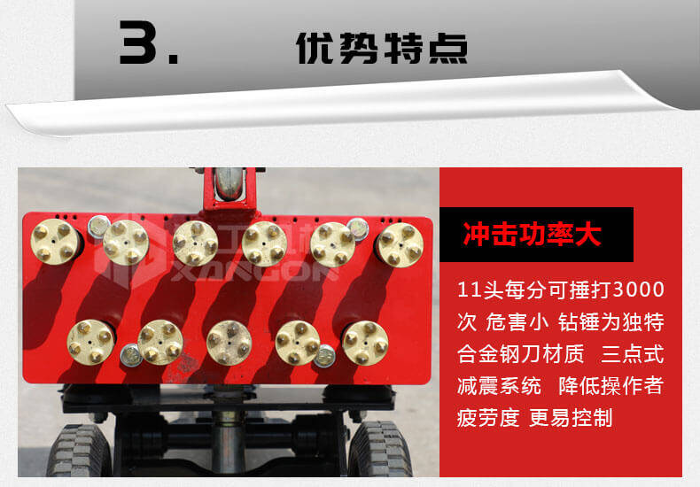 1、11個鑿毛頭的沖擊功率大,可達2200blow/分鐘,危害小;