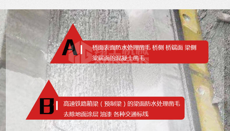 8、震動傷害小。 鑿毛機可在對主體無任何破壞的情況下,在1-100mm鑿剔深度之間自由掌控,鑿除混凝土表面光滑面積可達100%,鑿毛能力可根據混凝土的不同強度和深度,每小時可達到4m2--100m2的工作量。與傳統鑿毛工藝相比,可明顯加速工程進度,降低勞動消耗,減少環境污染,節省工程造價,實現理想的工程質量,具有廣闊的市場前景。