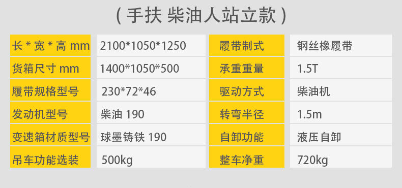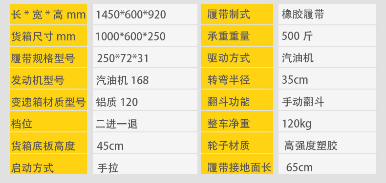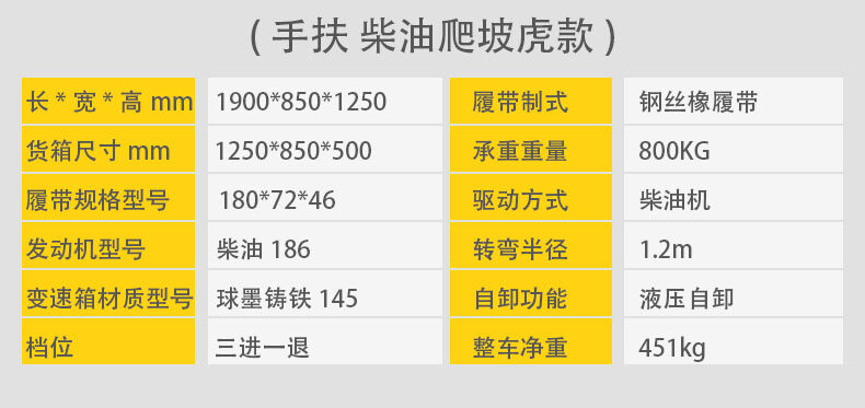 手扶式履帶運輸車它是采用手扶式的方式駕駛,自動靈活,安全可靠,可以在泥濘、結冰道路、沙漠、沼澤以及土質松軟或氣候條件不太好的接近角和離地角行駛。它的性能穩定,功能強勁,使用能力進一步提高。運載能力強,爬坡能力大,操作簡單,維修保養容易。