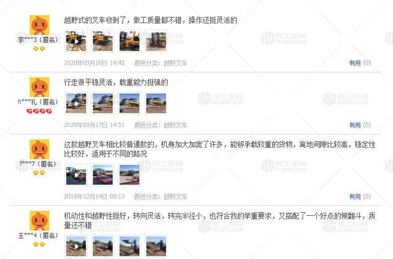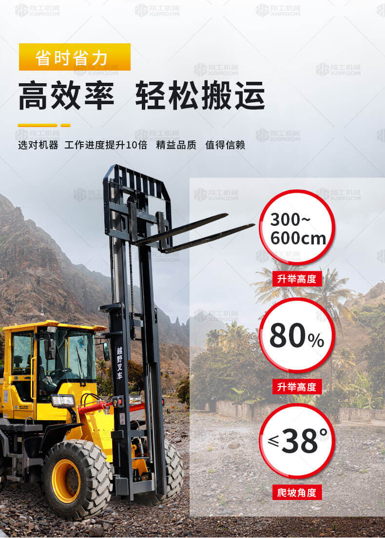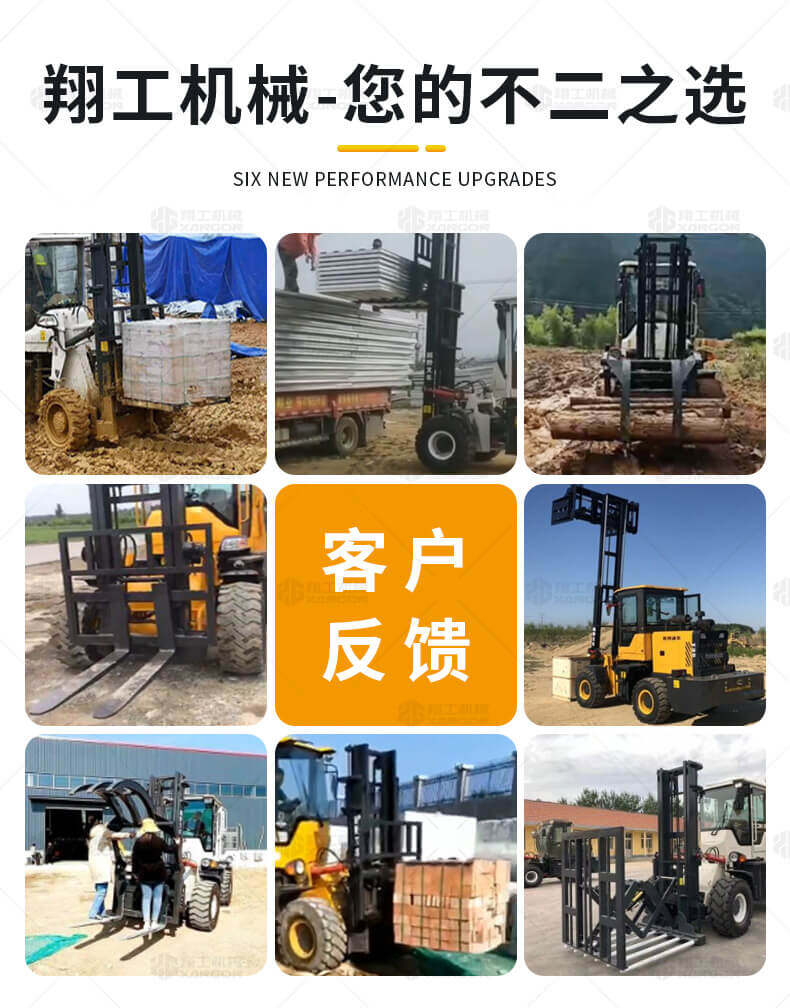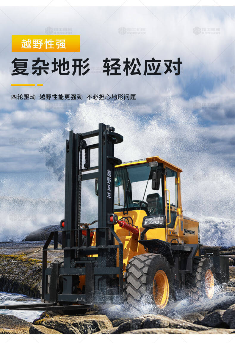 3.普通叉車只能在平整的路面上作業,而越野叉車既可以在普通路面上作業,還可以在山路泥路崎嶇道路作業,輪胎抓地力強,不打滑。