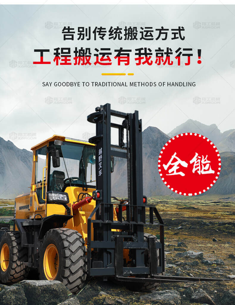 越野叉車可以在坡地和不平地面上進行貨物裝、卸、堆垛及搬運作業,具有良好的機動性、越野性可靠性。其功能多樣,可搭配側移器、調距叉、旋轉器、軟包夾、推出器、側翻叉、側翻斗、起重臂等工具完成不同的工作。