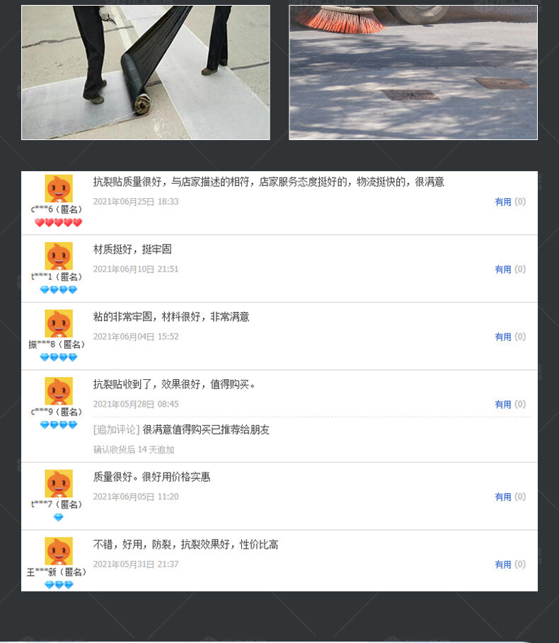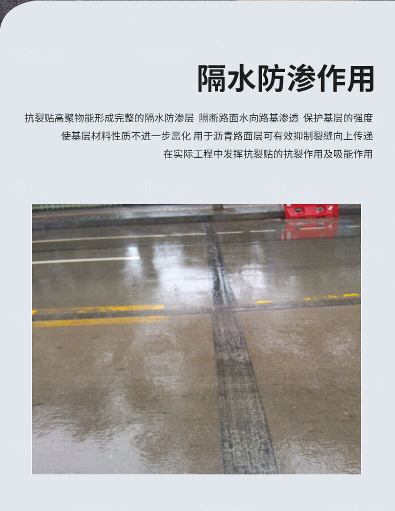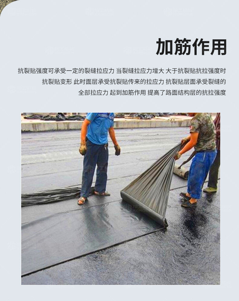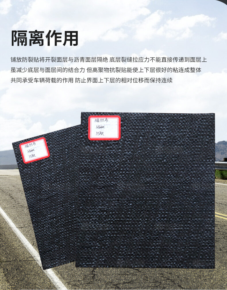 防裂貼(又稱(chēng)抗裂貼)是由瀝青基的高分子聚合物、抗拉胎基、耐高溫并與瀝青相容的織物復(fù)合而成。將其貼于產(chǎn)生裂縫或剝落的瀝青混泥土面,能減少并阻隔其作用于路面的溫縮應(yīng)力,因此也減少了裂縫反射穿過(guò)面層的趨勢(shì),鋪設(shè)與路面因其將基層與上部磨耗層隔離開(kāi)來(lái),從而使上面層免受多向位移及剪切應(yīng)力的影響,用于公路、橋梁、機(jī)場(chǎng)等。